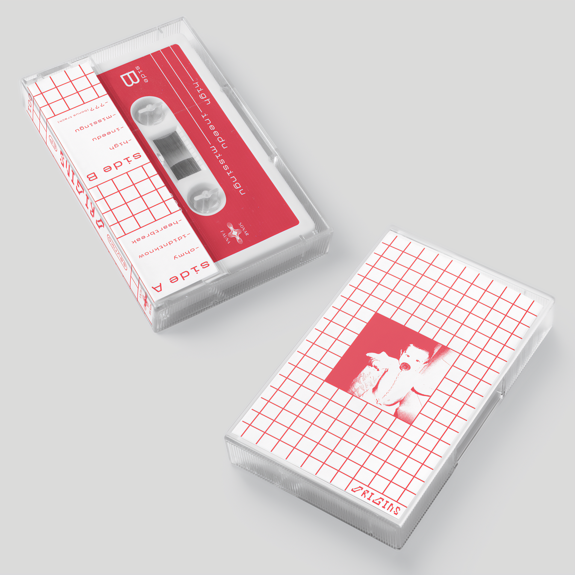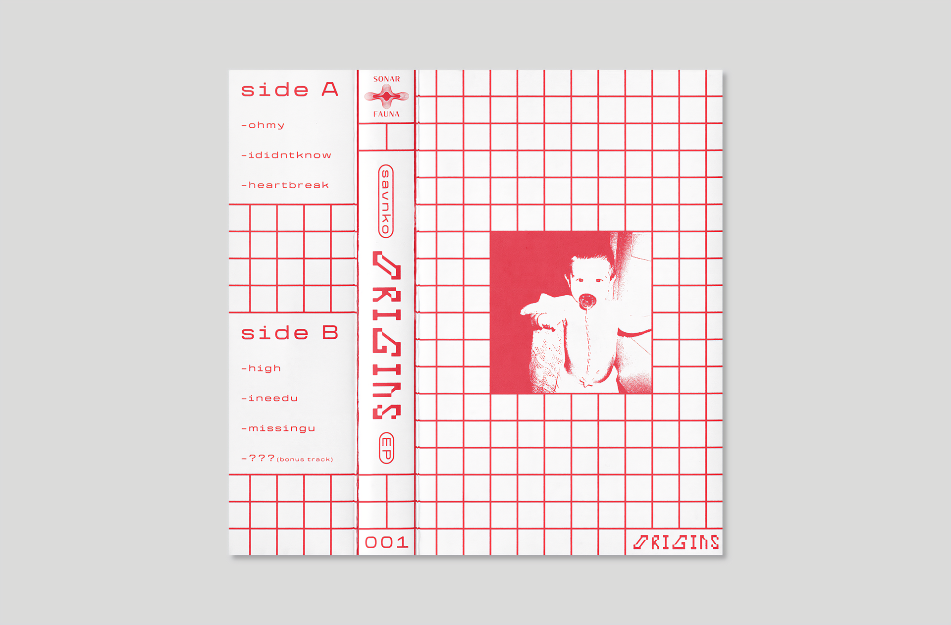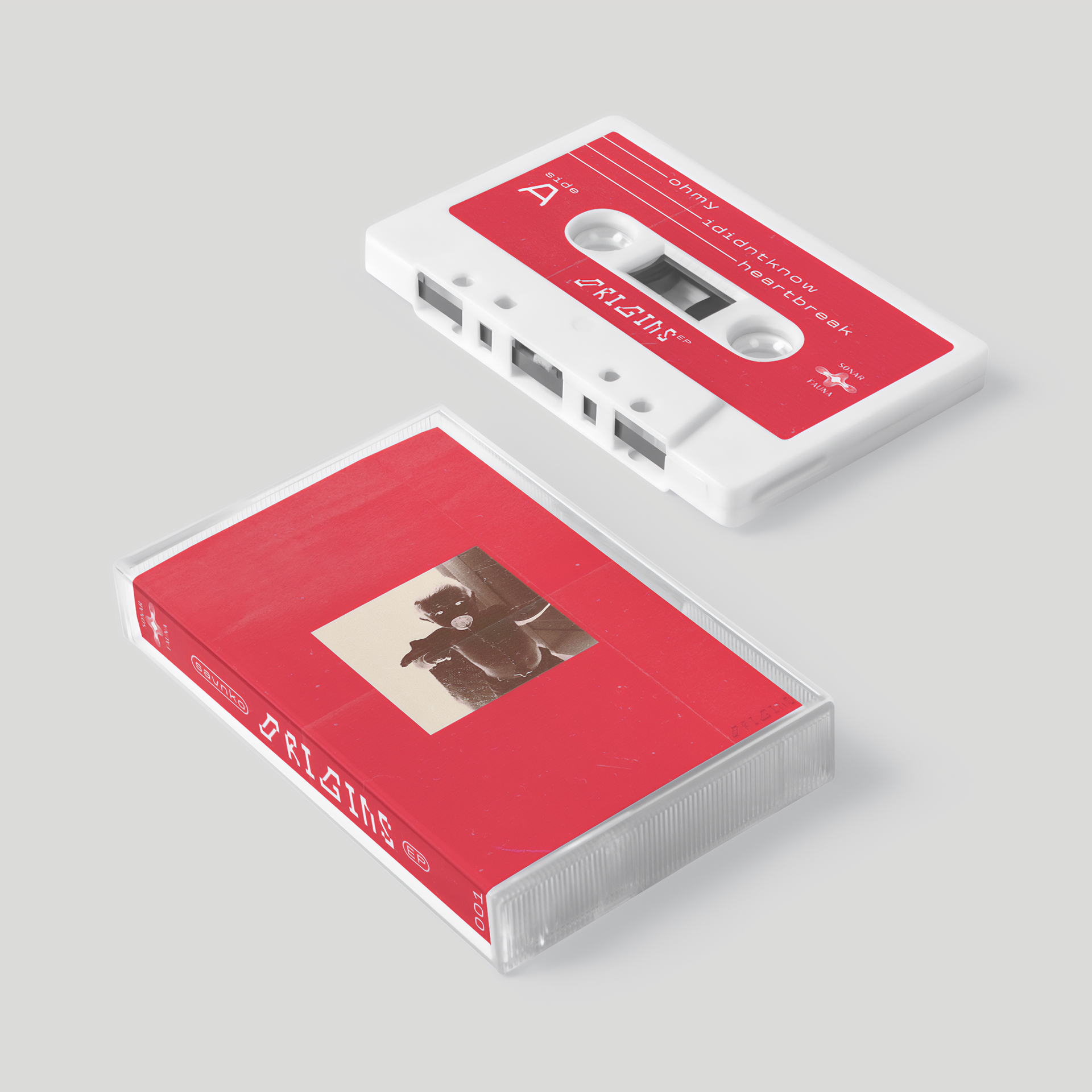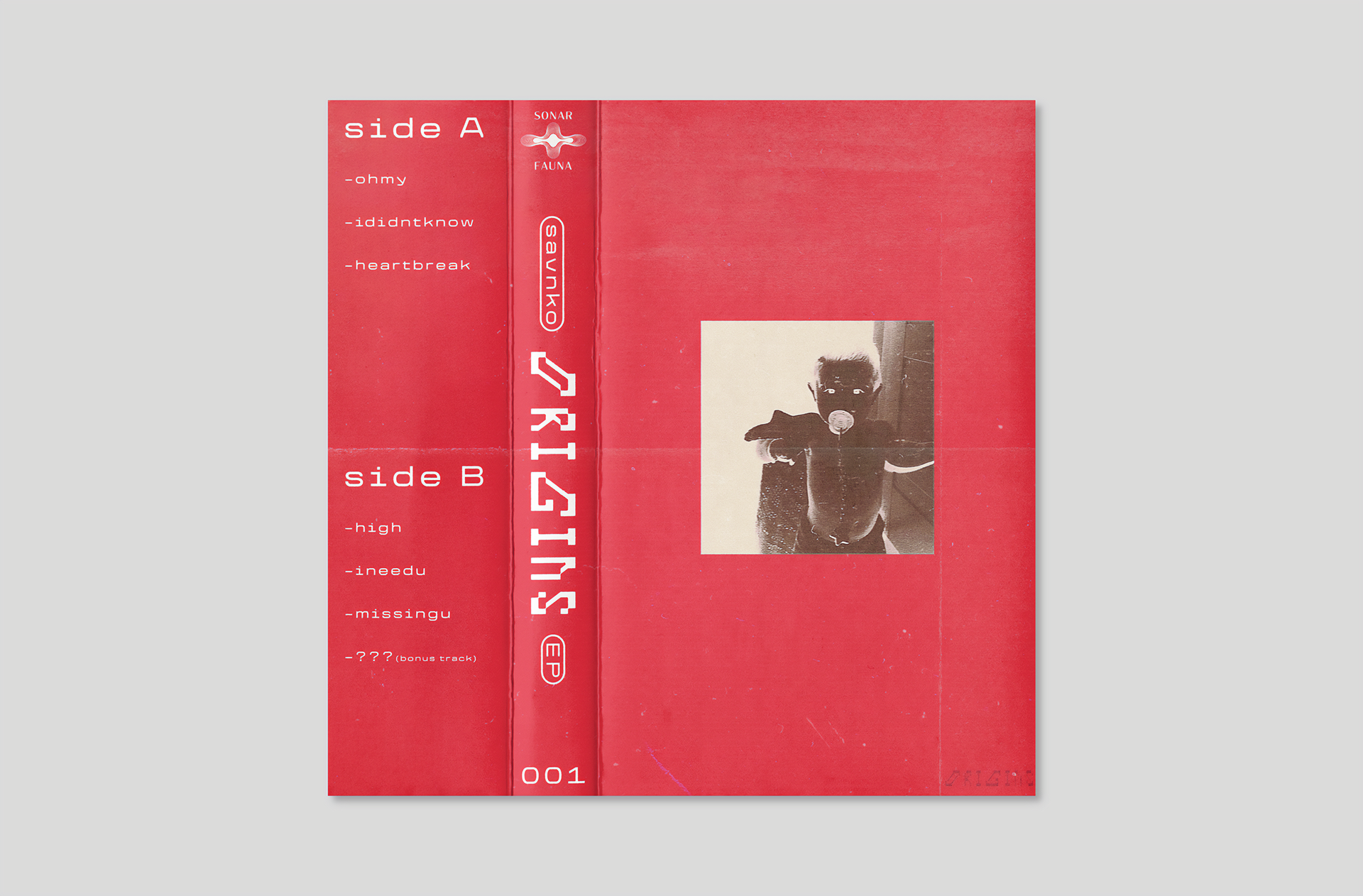 Graphic design and layout for Originsᴱᴾ, a cassette release by Savnko. Working from the artist’s provided cover image, I developed the visual system for the cassette packaging, creating a flexible J-Card that can be flipped to reveal an alternative cover. The design centers around a bold red and white palette, reflecting the EP’s distinctive color identity and reinforcing its visual impact across the physical release.